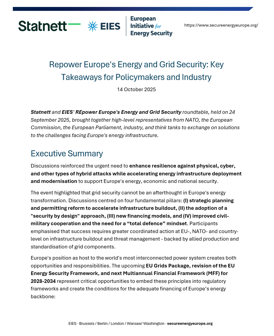 Statnett and EIES’ REpower Europe's Energy and Grid Security roundtable, held on 24 September 2025, brought together high-level representatives from NATO, the European Commission, the European Parliament, industry, and think tanks to exchange on solutions to the challenges facing Europe's energy infrastructure.